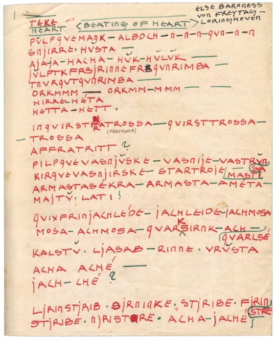 Figure 18: Elsa von Freytag-Loringhoven, Teke Heart (Beating of Heart) (1921). Ms., Papers of The Little Review, University Archives, Golda Meir Library, University of Wisconsin-Milwaukee. Photo: Charles Bernstein.
